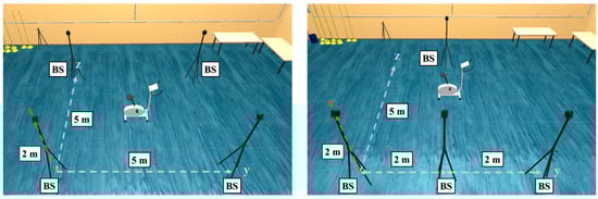 One sporty participant (25 years, male) completed the task, and his data were collected. The task was to ride the bike after the start signal given by the experimenter. The influence of three factors on the accuracy of the trackers’ position tracking was examined. One factor was the frequency in rounds per minute (rpm) that the participant pedaled with, which altered between 80 rpm, 120 rpm and 160 rpm. The factor was chosen to examine the influence of the movement speed and the associated acceleration on the tracking accuracy. With the help of a metronome, the participant was able to maintain the required frequency. In addition, he saw his current frequency on the ergometer and pedaled as close as possible to the demanded speed. Another factor was the position of the base stations, which were either placed in a rectangle (5 m × 5 m) or a kite formation (see Figure 2). The manufacturer recommended a rectangle formation. The kite formation was chosen to reduce the distance between the trackers and the base stations and to allow for three base stations to have immediate visual contact with the attached trackers to increase accuracy.