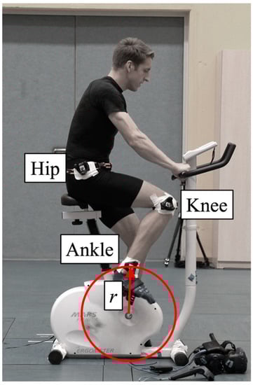 Illustration of the experimental setup and the positions of the three HTC VIVE Tracker 3.0 trackers with attached Vicon markers at the participant’s hip, knee and ankle. In addition to comparing the trajectories at the knee and ankle, the radius r of the ankle motion was calculated as a measurement accuracy parameter.