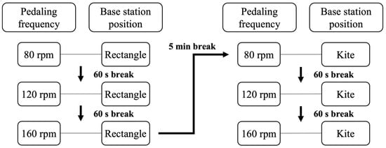 In total, there were six possible combinations, as shown in Figure 4, in their conducted order. Every condition was performed thrice for 30 s, one directly after the other, with a break of approximately 30 s. Afterward, there was a break of approximately 60 s, during which the condition was altered. After three conditions, there was a five-minute break to change and calibrate the base stations’ positions and minimize the participant’s exhaustion. To synchronize both measurement systems in time, the participant moved his knee to the side at the beginning of a trial. The resistance of the ergometer was set to 100 watts. For comparing both systems, the recording frequency of both systems was set to their optimum (Vicon 200 Hz; VIVE 90 Hz).