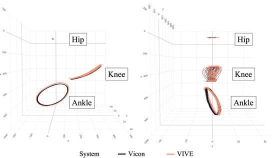 Based on the described knee movement to the side at the start of each trial, the two measurement systems were synchronized in time by removing all measured values before this event. Then, the hip-to-ankle distances were calculated for all time points to identify each cycle, with a single cycle always starting with a minimum hip-to-ankle distance. After determining the start time for the first cycle, the data set was trimmed according to the required number of complete cycles. To achieve the target measurement duration of 30 s, the number was exactly 40 cycles at a pedaling frequency of 80 rpm, 60 cycles at 120 rpm and 80 cycles at 160 rpm. Due to the different axis orientations of the two measurement systems, we used their corresponding unit vectors to calculate a transformation matrix to synchronize the spatial orientation of the coordinate systems. Therefore, the center of the hip marker trajectory was set as the origin, while the corresponding vectors to the knee and ankle spread the x–y plane, and the orthogonal vector through the origin represented the z-axis. The following figure (Figure 5) shows an example of the synchronized trajectories.