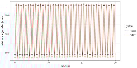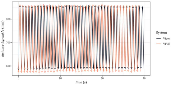 Using the respective correction factors, which corresponded to the reciprocal of the slope of the linear regression, the actual recording frequencies of the VIVE trackers were determined for all trials and their time stamps were adjusted. The figure below (Figure 8) shows the distance–time series of the corrected VIVE data compared to the original Vicon data. From this graph, the temporal correspondence of the cycles could be easily seen, so that with the help of the temporally corrected data, a comparison of both systems was now possible at any point in time.