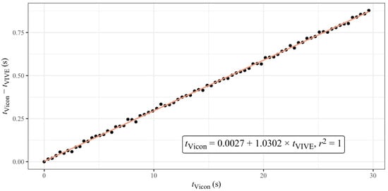 An initial comparison of the trimmed distance–time series between VIVE and the gold-standard Vicon revealed that the actual recording frequency of the VIVE trackers differed from the 90 Hz frequency specified by the manufacturer and configured in Unity (see Figure 6). To determine the actual recording frequency, we extracted the time stamps of all minimum and maximum distances between the hip and ankle for both systems, as these occurred simultaneously in reality. Figure 7 shows the time difference between VIVE and Vicon of the related extreme values for one trial as a function of the time measured with Vicon. As can be seen, a linear relationship existed between the time difference of both systems and the measurement times. A linear regression was used to calculate a correction factor for each trial of the VIVE trackers’ time points from these data.