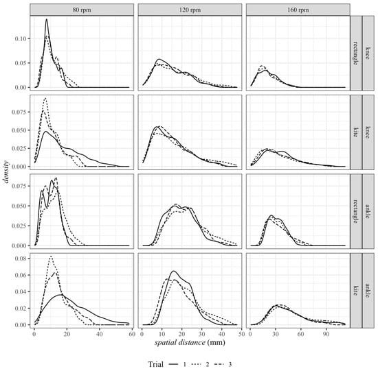 Distributions of the spatial distance (in mm) between VIVE and Vicon for all trials and the factor pedaling frequency (80 rpm, 120 rpm and 160 rpm), tracker position (knee and ankle) and base station position (rectangle and kite).