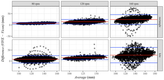 The Bland–Altman diagrams confirmed the previously described trend of systematic measurement errors between VIVE and Vicon (see Figure 10). Pearson’s correlation test between VIVE and Vicon showed a large effect (r > 0.5) for all conditions. The largest effect (r = 0.996, p < 0.001) was found at the pedaling frequency of 80 rpm and the rectangular arrangement of the base stations. On the other hand, the smallest effect (r = 0.713, p < 0.001) was shown for the kite-shaped setting of the base stations at the pedaling frequency of 160 rpm. Moreover, it could be observed that the dispersion of the deviations between both measuring systems slightly depended on the height of the measured values in the investigated radius measuring range between 90 and 180 mm. The largest correlation (r = 0.570, p < 0.001) between the difference and mean existed for the pedaling frequency of 80 rpm and the rectangular base station arrangement. The lowest correlation (r = 0.134, p < 0.001) was observed for the same pedaling frequency of 80 rpm for the kite-shaped arrangement.
