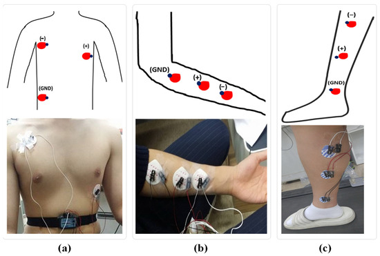 Electromyography (EMG) is a clinically well-known biopotential for evaluating and recording the electrical activity produced by skeletal muscles. It is used in various applications, including diagnosis of neuromuscular disorders, monitoring of muscular fatigue, investigation of muscle function, and as a control input for prosthetic devices [49]. However, electrodes used to measure EMG were quite challenging because EMG signals had a broader bandwidth of 10 Hz to 500 Hz. Moreover, the positions of the electrodes are also important during recording to obtain an accurate and equivalent EMG signal for both electrodes. The electrodes should be placed in an appropriate location, as presented in Figure 1b,c, to obtain a better correlation value for the EMG signals from the electrode pair. In this study, EMG signals were diagnosed for hand and leg muscle activities.