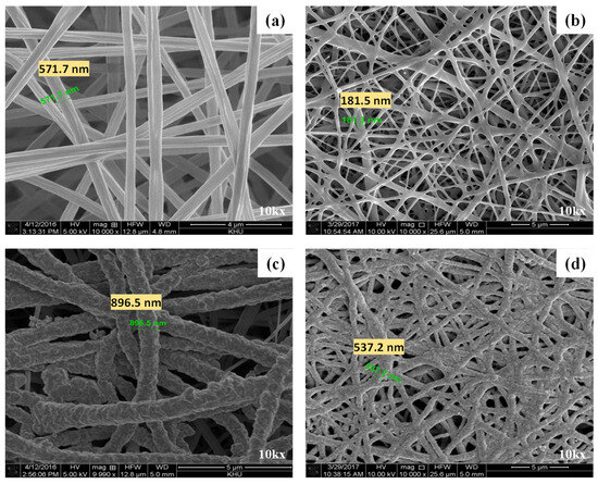 FIB-SEM images of as-spun CPI (a), as-spun SBS (b), silver-plated CPI (c), and silver-plated SBS (d) nanofiber webs.