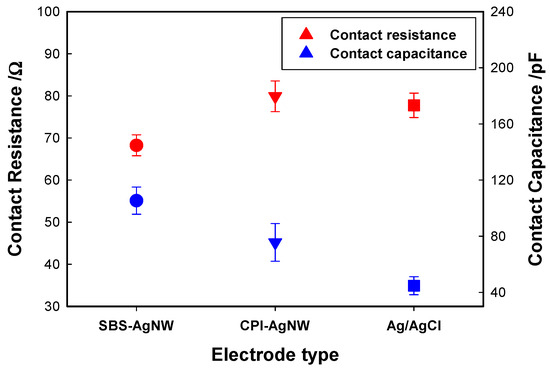 Figure 4 illustrates the resistive part (R) and the capacitive part (C); the contact impedance of each electrode averaged ten frequencies, ranging from 10 Hz to 500 kHz. In terms of the resistive component of each electrode, the R values of the SBS-AgNW dry electrode were lower, and the values of the CPI-AgNW dry electrode were marginal compared to those of the metal part of the Ag/AgCl gel electrode. This result is likely the consequence of two main contributions. One is primarily due to the high electrical conductivity of AgNW dry electrodes themselves, and the other is the attribution of the contact surface area [21]. The contact area is one of the main parameters influencing contact impedance, since the nanofiber webs usually have a high specific surface area, owing to their nanoscale fiber. In contrast, the SBS-AgNW dry electrodes present comparably larger mean C values, and the CPI-AgNW dry electrode shows a slightly larger value than the Ag/AgCl gel electrode, as shown in Figure 4. In the case of the SBS-AgNW dry electrode, the capacitors created between many conductive fibers are accumulated to provide a larger capacitance, but the electrical resistance is smaller through many contact points than in the CPI-AgNW dry electrode. For the capacitive (C) part, a higher value of C results in a lower contact impedance when increasing the frequency of the injected AC source.