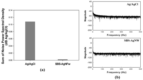 When evaluating new electrodes, the noise characteristic is an inevitable parameter. Specifically, the given low amplitude signal of bioelectric potentials is less than a few tens of mV in magnitude. Though many factors affect the noise characteristic of the electrode, its contact impedance largely governs the noise level. Each sum of noise power spectral density of Ag/AgCl and SBS-AgNW is illustrated in Figure 6a, and all values were normalized to the gain of Ag/AgCl electrodes to correct for the differences in gain of the SBS-AgNW electrodes, as presented in Figure 6b. The SBS nanoweb dry electrode detects much less noise than the Ag/AgCl gel electrode.