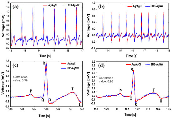 ECG recordings of the CPI-AgNW dry electrode and Ag/AgCl gel electrode (a); SBS-AgNW dry electrode and Ag/AgCl gel electrode (b); a comparison of the P, Q, R, S, T, and U features of ECG waveforms between the CPI-AgNW dry electrode and Ag/AgCl gel electrode (c); and SBS-AgNW dry electrode and Ag/AgCl gel electrode (d).