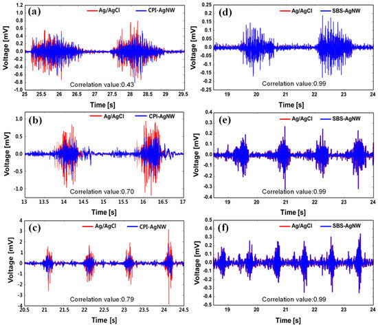 EMG recorded raw signals of leg muscle activities, such as a standing position (not walking, but the subject was asked to slightly clench and unclench his foot soles repeatedly during the test) and walking at speeds of 3 km/h and 6 km/h on a treadmill. The correlation coefficient between the CPI-AgNW dry electrode and Ag/AgCl gel electrode is 0.43, 0.70, and 0.79, respectively, as observed in Figure 9a–c. Similarly, Figure 9d–f represents a comparison of raw EMG data recorded in leg muscles in a standing position and walking at speeds of 3 km/h and 6 km/h speed using an SBS-AgNW dry electrode and Ag/AgCl gel electrode. The raw EMG signals were recorded for various leg muscle activities, i.e., at standing conditions, walking at speeds of 3 km/h and 6 km/h. The correlation coefficient between the SBS-AgNW dry electrode and Ag/AgCl gel electrode shows the same value of 0.99. Interestingly, the EMG signals of the SBS-AgNW dry electrode and Ag/AgCl gel electrode EMG signals are almost overlapped. There is no distinction of correlation in various muscle activities such as standing position and walking at speeds of 3 km/h and 6 km/h. On the other hand, the raw EMG signals from the CPI-AgNW dry electrode exhibited lower intensity than those from the Ag/AgCl gel electrode. Therefore, it can be concluded that the SBS-AgNW dry electrode shows noticeably better performance than the CPI-AgNW dry electrode in terms of EMG recording of leg muscles performing various activities, which is almost the same level of performance as the clinically used Ag/AgCl gel electrode. After all, for both the CPI-AgNW, SBS-AgNW dry electrode, and Ag/AgCl gel electrode, it is observed that the leg muscle activities were also identified equidistantly with the increased walking speed is visible in signaling frequency as per leg muscles activities.