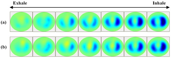 Series of time-difference pulmonary images representing air volume changes during inspiration recorded through the EIT system at an injection current of 1 mA and a frequency of 10 kHz using Ag/AgCl gel electrodes (a) and SBS-AgNW dry electrodes (b). The yellow, green, and blue denote high, medium, and low impedance, respectively.