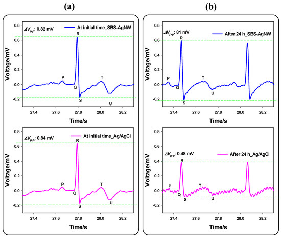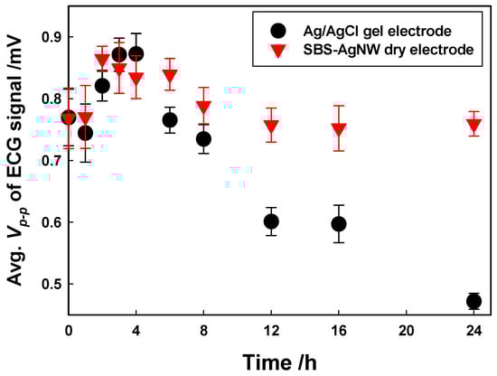 The average peak-to-peak voltage (Vp-p) intensity of the ECG signal was obtained for SBS-AgNW and Ag/AgCl electrodes at various time intervals until 24 h.