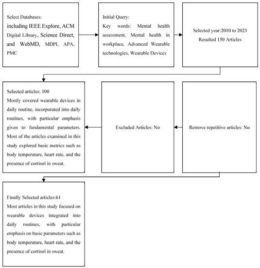 The systematic literature review was conducted in a specific order, as shown in the chart. Initially, 100 research articles were considered for the study based on the selected keywords, such as wearable devices, mental health assessment, mental health in the workplace, and advanced wearable technologies. The articles were then screened based on their year of publication, and only those published after 2010 were included in order to rely on recent research regarding the research topic. However, the subject’s origin was also important to consider, and some theories, histories, and backgrounds from previous research were included but not relied upon completely. It should be noted that wearable devices have been used to assess physical and biological functions for many years, but their use for mental health assessment has only been introduced recently.