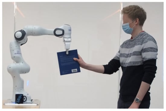 Example of an indirect pHRI application: a collaborative robotic arm mediates the interaction between the user and an object, such as handing over a book.
