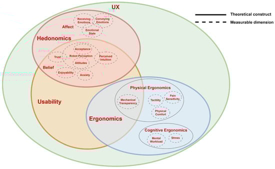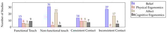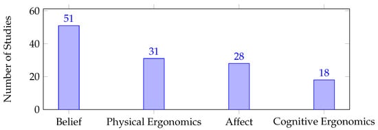 Physical ergonomics encompasses the potential adverse effects on the human body during an interaction, such as postures, repetitive movements, heavy workloads, or forces. Cognitive ergonomics is concerned with designing systems that align with the perceptual and psychological abilities of the users. Affect pertains to emotional-related terms, whereas belief refers to the cognitive responses that can trigger emotions (i.e., affective responses).