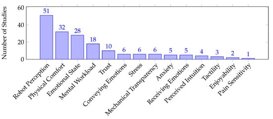 Similarly, classifying human factors has been a major challenge in this review due to the lack of systematic or standardized definitions in the HRI literature, making it difficult to determine the most commonly addressed human factor. For example, some studies use terms like stress [19], strain [20], and frustration [21] without providing clear definitions, making it inaccurate to group them together under one umbrella term. Likewise, the legibility [22] and predictability [23] of a robot’s motion, and physical ergonomics [24], physical comfort [22], fatigue [25], and health and safety [26] are two sets of examples of the different human factors that overlap but cannot be lumped under a single comprehensive term within the set. Additionally, perceived enjoyment [21] and enjoyability [27], and psychological safety, mental safety, and subjective safety [8] are also examples of the human factors that are distinct but interconnected. We anticipate that this may have caused an unintentional research bias in favor of the human factors that have limited synonyms like trust. Trust has been identified as a common human factor in several HRI reviews and has even been given special attention in dedicated reviews [28].
