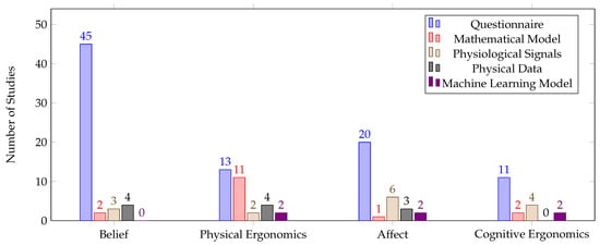 - Which of the four human factor categories (belief, affect, physical ergonomics, and cognitive ergonomics) is most frequently investigated to develop the quantitative measures of the human state?