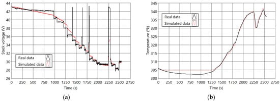 The model was developed using LabView, and it consists of several equation blocks regarding different features such as voltage losses, heat losses, active pressure, and overall potential. Each block allows the estimation of non-measured variables, such as the reaction’s temperature, the voltage of the terminal, or inner pressures. Figure 2 shows a scheme of the model and the coefficients of each equation block. Figure 3 shows the results of the fitting process. In Figure 3a, real and simulated voltage signals are represented, and in Figure 3b, temperature signals are shown. The model’s coefficients were fitted using a Scout Evolutionary Algorithm and achieved an error rate of 2.21% for the voltage signal and 1.97% for the temperature signal.