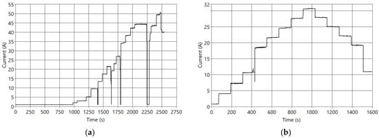 Real current demand curves. (a) Idle, load ramp, and regime change; (b) Load and discharge ramps.