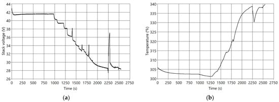 A real current demand profile has been used as an input of the digital twin (Figure 4b). This profile includes three of the four fuel cell operating zones mentioned in the previous section: idle with minimum current levels (time = [0, 100]), a loading ramp where the current increases (time = [1000, 2000]), and load regime changes (time = [2000, 2547]). Obtaining real data in overload conditions is not possible due to the performance of the fuel cell protection systems. Figure 4b shows the input current profile, and Figure 5a,b show the simulated output signals of voltage (V) and temperature (T) when fault F7 is active.