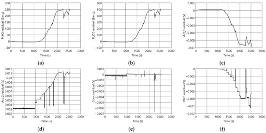 The faults are simulated by modifying input signals or parameters of one of the equation blocks. As a result, the signals of the digital twin are altered. A fault-free model runs in parallel and allows the residual generation for all the available signals. In this case, the residuals are the point-to-point difference between the digital twin’s output signals and the fault-free model’s output signals. Table 3 summarizes the faults and the signals that must be changed to conduct simulations.