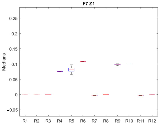 The next step is to analyze which residuals have significant differences. This analysis is done with the Dwass–Steel–Critchlow–Fligner (DSCF) test, which compares the residuals pairwise. It is tuned using the Wilcoxon (W) statistic with a p-value of 5%. The DSCF test [] is a non-parametric multiple comparison test used to assess differences between multiple groups in statistical data. It is particularly useful when data violate assumptions of normality and homogeneity. DSCF extends the pairwise Wilcoxon rank-sum test to provide adjusted p-values for multiple comparisons while controlling the familywise error rate.