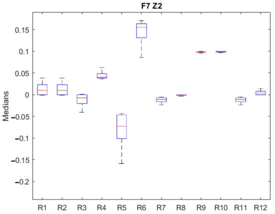 The second step is to determine statistically whether the residuals are affected by the failure or are due to modeling errors, for which the t-Student test is applied with a significance level of 0.5%. It is also necessary to determine whether there is a significant difference between the residuals of the signals. This issue is resolved by applying a one-way ANOVA test that can be parametric or non-parametric, i.e., to define whether the residuals have equal variance. It is defined by Lenvene’s homoscedasticity test of the data. In this work, the non-parametric Kruskal–Wallis one-way ANOVA test is applied. The Kruskal–Wallis [] test is a non-parametric statistical test used to determine if there are significant differences in the medians of three or more independent groups. It is an extension of the one-way ANOVA for situations where data does not meet the assumptions of normality or homogeneity of variances.