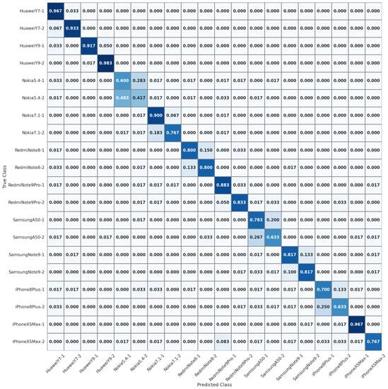 Further, we proceed to the experiment of individual source camera identification, where we aim to identify specific devices among a set of 20 devices in the QUFVD dataset. This device-level identification scenario allows us to evaluate the effectiveness of our new fingerprint in distinguishing between different devices. ISCI scenario is more challenging than SCMI. As illustrated by the confusion matrix in