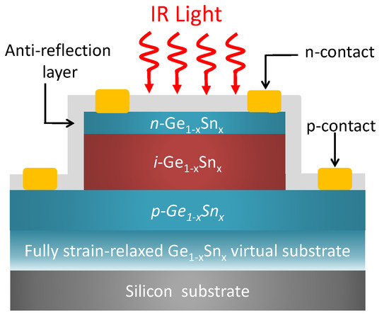 - Tseng, H.H.; Li, H.; Mashanov, V.; Yang, Y.J.; Cheng, H.H.; Chang, G.E.; Soref, R.A.; Sun, G. GeSn-based p-i-n photodiodes with strained active layer on a Si wafer. Appl. Phys. Lett. 2013, 103, 231907. [Google Scholar] [CrossRef]