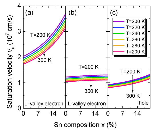 - Mukhopadhyay, B.; Sen, G.; Basu, R.; Mukhopadhyay, S.; Basu, P.K. Prediction of large enhancement of electron mobility in direct gap Ge1−xSnx alloy. Phys. Status Solidi B. 2017, 254, 170024. [Google Scholar] [CrossRef]