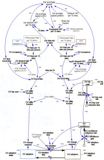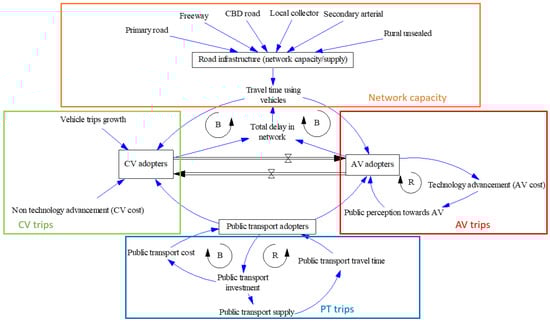 - Inputs such as current traffic, road capacity, public perception, and technological advancement of AVs are used to assess the effects of different policy options on the transport systems. An SD approach has been adopted for the present study because it can incorporate the dynamic interactions [] between different travel modes and the feedback loops that could affect the mode shift behaviour. To our best knowledge, this is the first time using an SD model to investigate the impacts of AVs on mode shift in the Australian context.