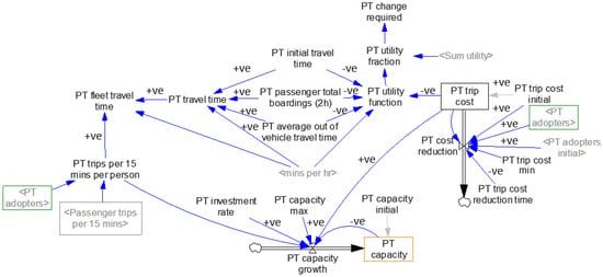 Figure 3 shows the public transport sub-model. The trips generated by public transport depend on the adoption by AV and CV users. Table 3 shows the sub-model’s equations, values, and units for the key variables and stocks.