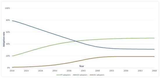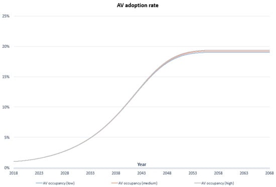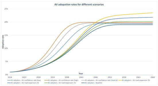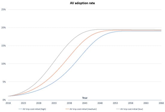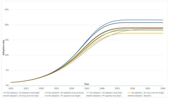In scenario 2, the base case for ‘AV trip cost min’ for calculating the utility function was assumed to be 400 (baseline scenario), the same as the ‘CV trip cost’. However, the Australia-wide survey results showed that around 20 per cent of respondents preferred shared AVs for daily work, reducing the average cost of an AV trip []. Thus, the ‘AV trip cost min’ for the low scenario was set to 360. Conversely, for the high scenario, the Australia-wide survey results revealed that the respondents thought AVs were worth more than CVs []. As a result, the ‘AV trip cost min’ for the high scenario was assumed to be 430. It was essential to consider preferences and perceptions towards AVs in determining the AV trip cost, as these play a significant role in influencing the adoption rate of AVs. Cost factor was one of the critical factors affecting the adoption rate of AVs. Thus, it was necessary to examine various scenarios to identify the potential effects of AV trip costs on the adoption rate of AVs.