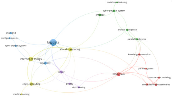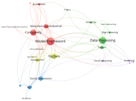 When drilling down into the research topic of CPSS, the largest areas of research focused on big data and the IoT; see Figure 5. In this model, the oldest research areas included IoT, intelligent systems, and social manufacturing. The newest areas included computational modelling, the Metaverse, and computational experiments.