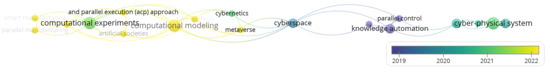 When considering the intersection of topics, research that focused on both CPSS and complex systems was clustered across a linear scale. The oldest research topics were located in the center, with newer research extending to either side, as shown in Figure 6. The oldest research was associated with knowledge automation and parallel control, with newer research associated with computational modeling, smart manufacturing, task analysis and the Metaverse.