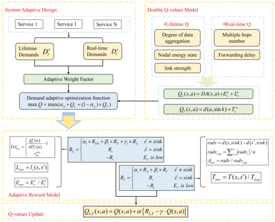 Q-learning is a model-free reinforcement learning algorithm whose core is the Q-value and reward [31]. In order to maximize the network life cycle and meet the functional requirements of various types of sensors, this section presents an adaptive communication routing algorithm based on improved Q-learning, as shown in Figure 3.