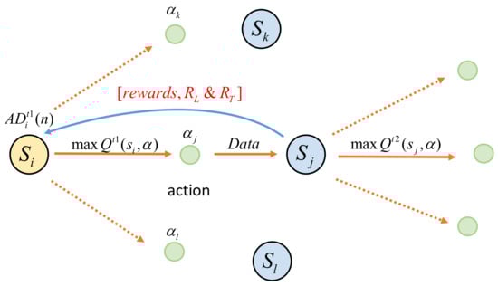 In the proposed double-Q-value learning model for high-speed railway wireless monitoring network routing, adjacent nodes exchange routing information in a cooperative way to ensure that nodes in the network can dynamically follow network changes and reduce the burden of maintaining the global routing table [34]. We define a sensor node’s node set S, action , and action state set A as follows when it sends a specific type of data to the next hop node: