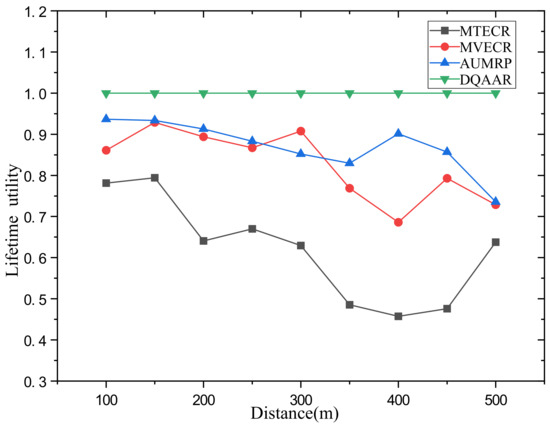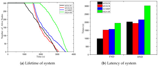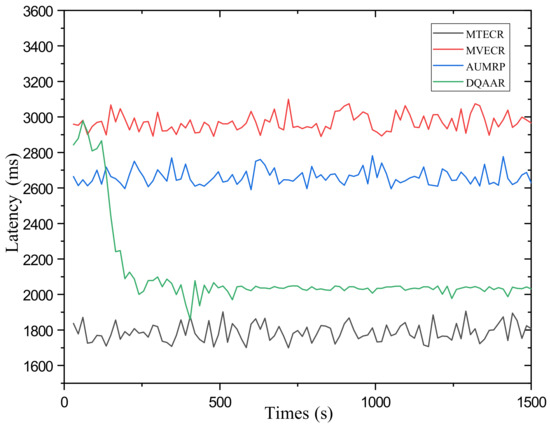 Figure 6 shows the real-time performance of DQAAR and the three protocols mentioned above. MTECR achieves the best real-time performance with an average latency of 1780 ms, but this is due to its advantage of reducing hop count at the expense of lifetime. In the initial stage of the network, DQAAR is in the parameter adjustment stage with significant delays. After a period of learning, its real-time performance is greatly improved, which is not much different from MTECR. AUMPR and MVECR excessively pursue the balance of energy consumption between nodes and achieve node energy balance by increasing the number of link hops. Long link hops greatly increase system latency.