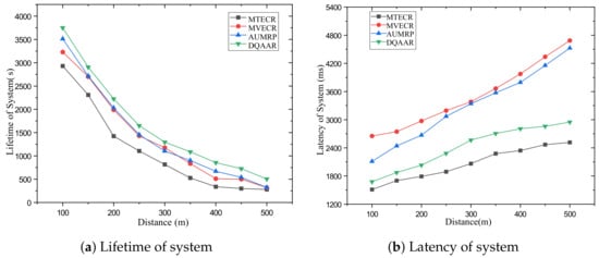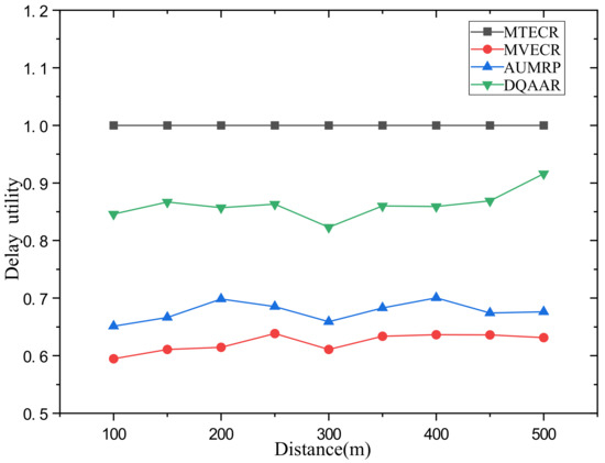 Obviously, the DQAAR proposed in this paper is ahead of AUMRP, MTECR, and MVECR in energy efficiency. When the network range is small, the life cycle of AUMRP and MVECR is close to that of DQAAR, and their comprehensive energy efficiency is also close to that of DQAAR. The life cycle index and delay index of the network system using each protocol are shown in Figure 8 and Figure 9.