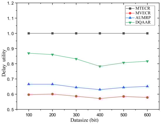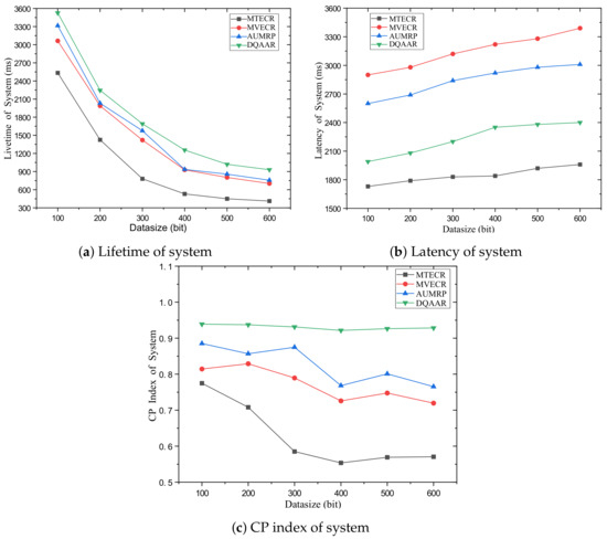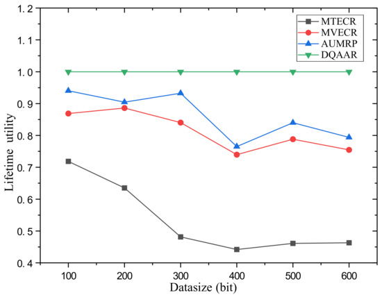 Case 2 verifies the impact of changes in the amount of data in the network on its performance and the performance of the four routing protocols. Among them, the network range is d = 200 m. Figure 10 shows the network life cycle, delay and comprehensive energy efficiency level of the DQAAR proposed in this paper and the other three routing protocols (AUMRP, MVECR, and MTECR) when the single data packet size of the network node changes from Data = 100 bit to Data = 600 bit. As shown in Figure 10a, an increase in the amount of data in the network is accompanied by a rapid decrease in its life cycle, because the sending and receiving of data consumes the most energy in sensor nodes. MVECR pays too much attention to the energy consumption balance of each node in the network, but it increases its total energy consumption, and the life cycle has a disadvantage compared with AUMRP. The DQAAR transmission path planning based on data aggregation effectively reduces the amount of data in the network and thus prolongs the life cycle of the network, and its performance is higher than the other three routing protocols. The delay of the network system using DQAAR is smaller than that using AUMRP and MVECR but slightly larger than that using MTECR, and the delay increases with the increase in data volume, which is caused by the increase in transmission time caused by the increase in data volume. Data latency increases. Also, as the amount of data increases, the trend of delay growth for DQAAR is not as fast as it is for AUMRP and MVECR. This shows that the data transmission delay is reduced enough by the data aggregation strategy used in this paper to make up for the time it takes to aggregate the data. It can be seen in Figure 10c that DQAAR can effectively reduce the amount of data when the amount of data in the network increases, while the delay does not cause a significant change. Its comprehensive energy efficiency is much greater than that of the other three routing protocols. The cycle and delay maintain stable performance with the increase in data volume.The lifetime index and delay index of the network system using each protocol are shown in Figure 11 and Figure 12.