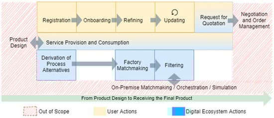 Such an open collaborative data ecosystem is created by the Catena-X initiative (https://catena-x.net/en, accessed on 6 July 2023), which is a large-scale innovation project for the automotive industry accompanied by an association (cf. Section 2.2) dedicated to develop an ecosystem for data-driven value chains for the automotive industry. In dedicated working groups, Catena-X is structured into several use cases, such as online control and simulation, demand and capacity management, modular production and Manufacturing as a Service (MaaS). MaaS can be defined as the shared use of distributed production lines and manufacturing infrastructures to produce components or products [2]. The MaaS working group [3] of Catena-X aims at supporting sustainable, resilient, and open production networks and supply chains. For this, the working group develops digital solutions for the matchmaking between demanded and offered manufacturing capabilities, whereby the latter ranges from the production of entire products down to individual manufacturing steps. The respective topics include services supporting the request and order management, enabling the interoperability to achieve a network of networks compliant with the Gaia-X (cf. Section 2.1) data sovereignty guidelines [4]. Thus, the working group concentrates on building a digital ecosystem for MaaS.