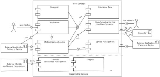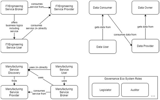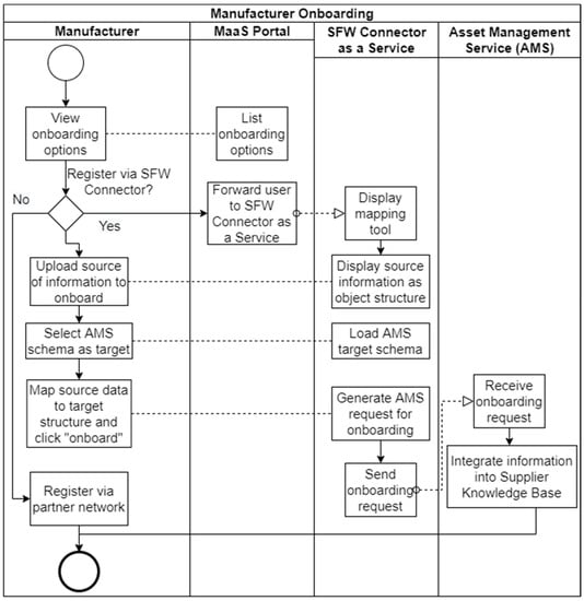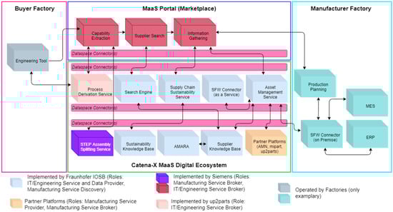 Landolfi et al. (2019) [26] describe a reference architecture for an MaaS platform architecture called MANUSQUARE, which has been developed in an EU project of the same name (www.manusquare.eu, accessed on 17 July 2023). MANUSQUARE enables an ecosystem and includes a virtual marketplace that connects manufacturing service providers and consumers. It focuses on the integration of IDS connectors for secure trusted data exchange and a product life cycle assessment. The reference architecture of Landolfi et al. is similar, in some approaches, to the SFW. However, the MANUSQUARE architecture provides a gateway orchestrator, which implements the business processes for which the architecture is used. The SFW, on the other hand, does not define how the business processes are implemented and leaves the service orchestration to the service brokers (specifically, the applications implementing the business logics). Moreover, the MANUSQUARE suggests single Application Programming Interfaces (APIs) for the gateway orchestrator and an “Ecosystem Data Manager”, which is a monolithic data management and data flow application. In contrast, the SFW suggests the use of services with respective APIs to provide purpose-driven APIs and lightweight service implementations to allow more fine granular access control, better scalability, and an open, unrestricted service landscape. The MANUSQUARE architecture is highly adapted to the IDS architecture. Nevertheless, the authors seem to have misinterpreted the IDS reference architecture, which can be seen by the misuse of internal and external connectors (cf. Figure 2 in [26] as compared to [27]). Unfortunately, the software developed in the MANUSQUARE project is no longer available and can neither be used nor reviewed.