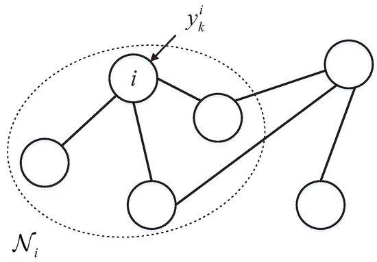 In particular, it is allowed to have individual sensors for independent detection, that is, . The dynamic weight matrix at instant k is defined as to represent the information exchange weights between node i and node j. All inneighbors of node i is denoted as , it can be represented by Figure 1. To describe the scale of a sensor network, the longest path between two nodes is defined as the diameter of graph .