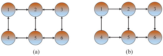 As this subsection assumes a scenario of multi-sensor information fusion, there are multi-sensors serving as input sources for detection information. And all sensor nodes possess routing capabilities. To obtain the most accurate global information under different scenarios, a communication topology network is established between sensor nodes to transmit the detected information from one sensor to another. Therefore, the communication topology among sensors is described as , which consists of a node set , an edge set , and an adjacency matrix , . For an undirected graph, that is, , this means that node i and node j can perceive each other. And the elements of the adjacency matrix satisfy , otherwise, . In this case, node j is called a neighbor of node i [26,31,32].