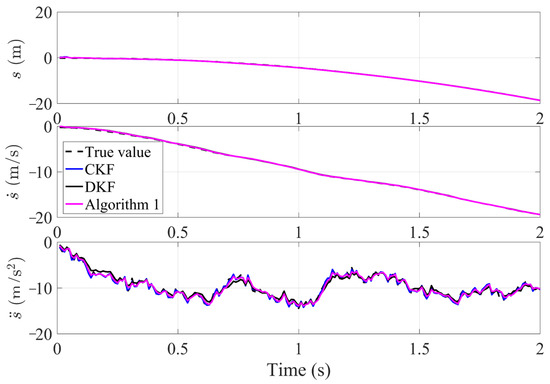 Based on the calculation results of MSE, Figure 4 shows the MSE comparison between the proposed Algorithm 1, DKF and CKF algorithm in this paper. The MSE of all algorithms is very small, which means they all have excellent tracking performance. By careful observation, after a finite number of iterations over time, the information from each sensor is transmitted to the other sensors through the sensor network, the MSE of Algorithm 1 gradually stabilizes. It is evident that the MSE of the proposed Algorithm 1 is smaller and more stable than DKF. This is attributed to the introduction of the finite-time control strategy and the optimal matrix weighting technique.