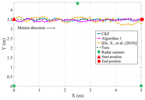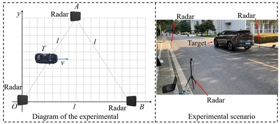 To verify the fusion performance of Algorithm 1 in observing moving targets, an experimental setup was arranged as depicted in Figure 7. Using the moving target plane as the coordinate system, three 24 G millimeter-wave radar sensors (Nanoradar SP25 millimeter-wave radar) were situated at coordinates (0, 0) m, (5, 0) m, and (, ) m, respectively. The target originated from the position (0, ) m and moved at a nearly uniform velocity parallel to the positive x-axis. Each sensor primarily measured the target’s relative distance and relative bearing, which were then transformed to the origin (0, 0) at the same location using the sine theorem.