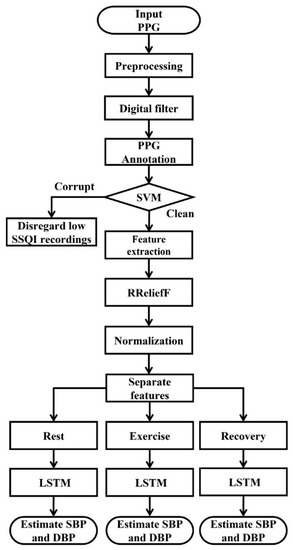 In this study, the proposed BP estimation method involved signal preprocessing, feature extraction, and BP estimation; the processing procedure is illustrated as a flowchart in Figure 2.