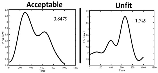 During the preprocessing, a skewness signal quality index (SSQI) was applied to each PPG signal. As motion artifacts can affect the PPG signals during exercise, the signal quality must be appropriately annotated. The increased skewness of the PPG signals revealed a detailed morphology of the pulse waveform [27]. Therefore, skewness (i.e., the optimal SQI) can potentially be used to improve the diagnosis and monitoring of abnormalities such as hypertension. The optimal SQI for PPG-based technologies forms the first step toward BP estimation. We focused on improving the accuracy of diagnoses and the quality of care by applying SSQI to acquire high-quality signals in various conditions (e.g., resting, exercise, and recovery). The annotation of the entire signal was based on the most dominant beat wave quality within the signal, which enabled clear classification of the groups into acceptable and unfit signals for estimating the SBP and DBP exhibited in Figure 3.