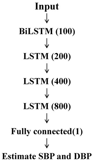 After feature extraction, the feature matrix was trained using machine learning algorithms. The analysis was performed in three phases: rest, exercise, and recovery. The LSTM layer, designed for sequence learning, proves effective in estimating BP [30]. In this study, we employed it as the primary component of our learning model. To validate the fundamental assumption, the LSTM comprised a single-layer bidirectional LSTM (BiLSTM), followed by three layers of LSTM, a fully connected (FC) layer, and a regression layer as the output. In particular, the BiLSTM was used in the first layer to capture information from the accepted input signal. All three phases used the same model with an architecture, initiating with a single layer of BiLSTM, consisting of 100 hidden units, followed by three LSTM layers with hidden sizes of 200, 400, and 800 units, respectively. The mini-batch size was 256 with 850 epochs and an initial learning rate of 0.004. The details of the architecture are displayed in Figure 5. In each phase, 70%, 15%, and 15% of data were used as training, test, and evaluation data, respectively.