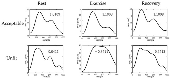 The typical examples of PPG signals with acceptable and unsuitable waveforms are presented in Figure 6. Although the second peak was clearly observed in the PPG waveforms during rest and recovery, it exhibited a low amplitude during exercise. The rejection ratios of the PPG signals after SSQI analysis are listed in Table 2, wherein the rejection rates were 23.9% at rest, 69.0% during exercise, and 16.1% during recovery.